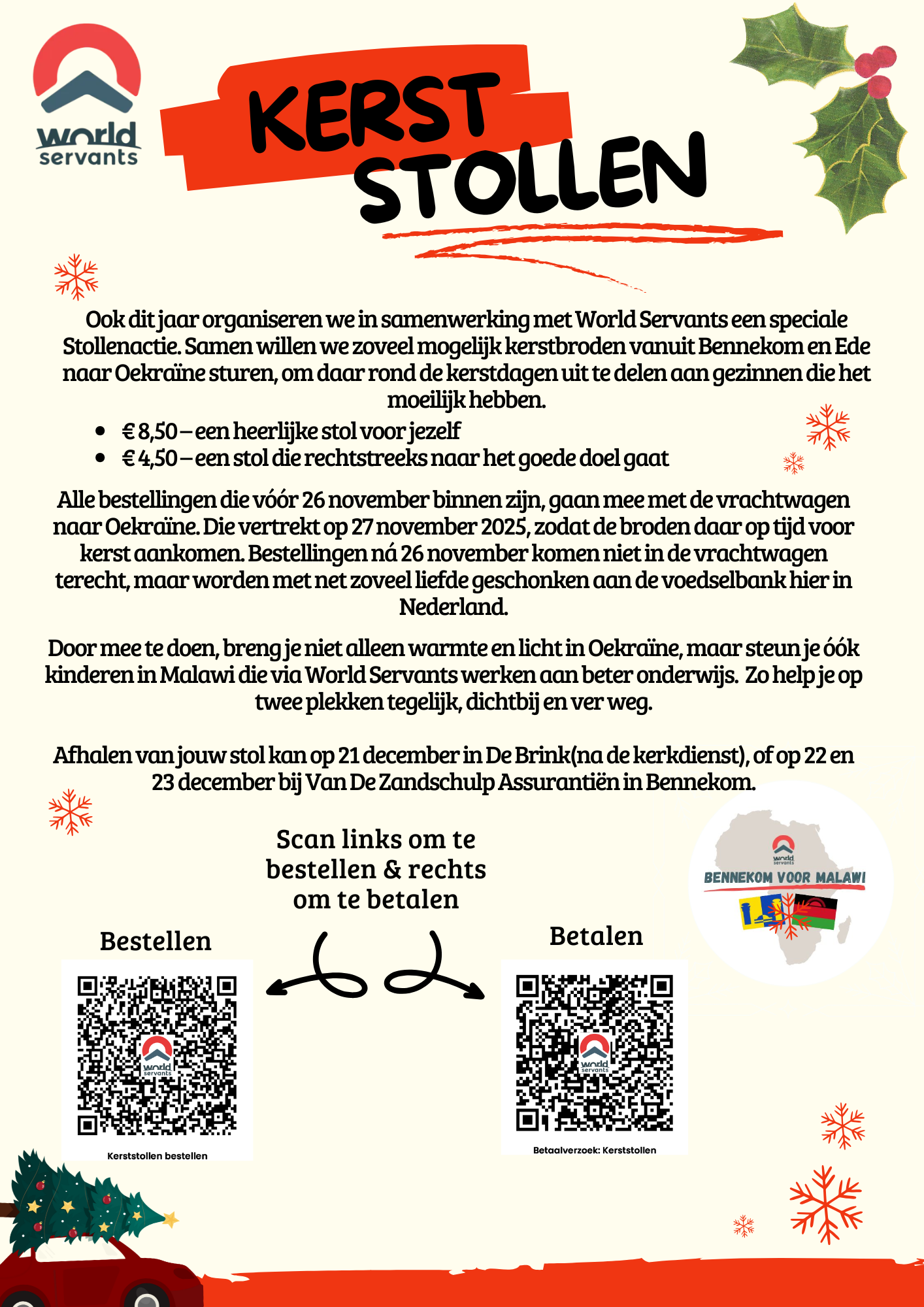 Ook dit jaar organiseren we in samenwerking met World Servants een speciale Stollenactie. Samen willen we zoveel mogelijk kerstbroden vanuit Bennekom en Ede naar Oekraïne sturen, om daar rond de kerstdagen uit te delen aan gezinnen die het moeilijk hebben.