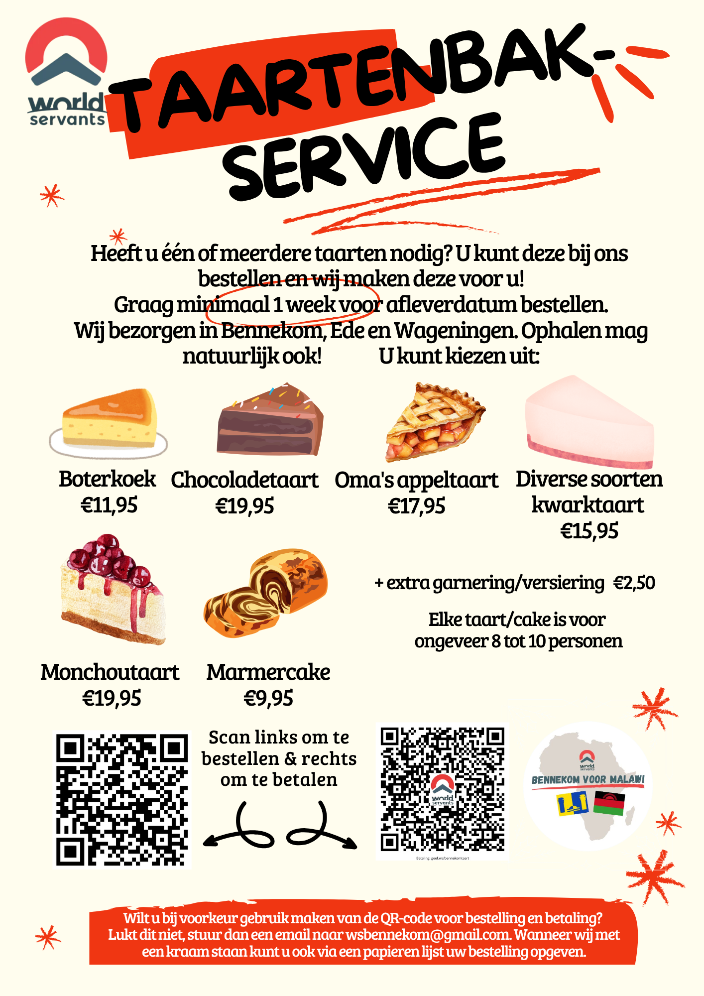 ✉️ Bestellen of meer informatie: stuur een e-mail naar wsbennekom@gmail.com met in het onderwerp Taartenservice en in de tekst van de e-mail de taartkeuze, de bezorggegevens en uw (mobiele) telefoonnummer. Dan bellen wij u zo spoedig mogelijk terug om de opdracht te bevestigen. Pas dan is de bestelling definitief!